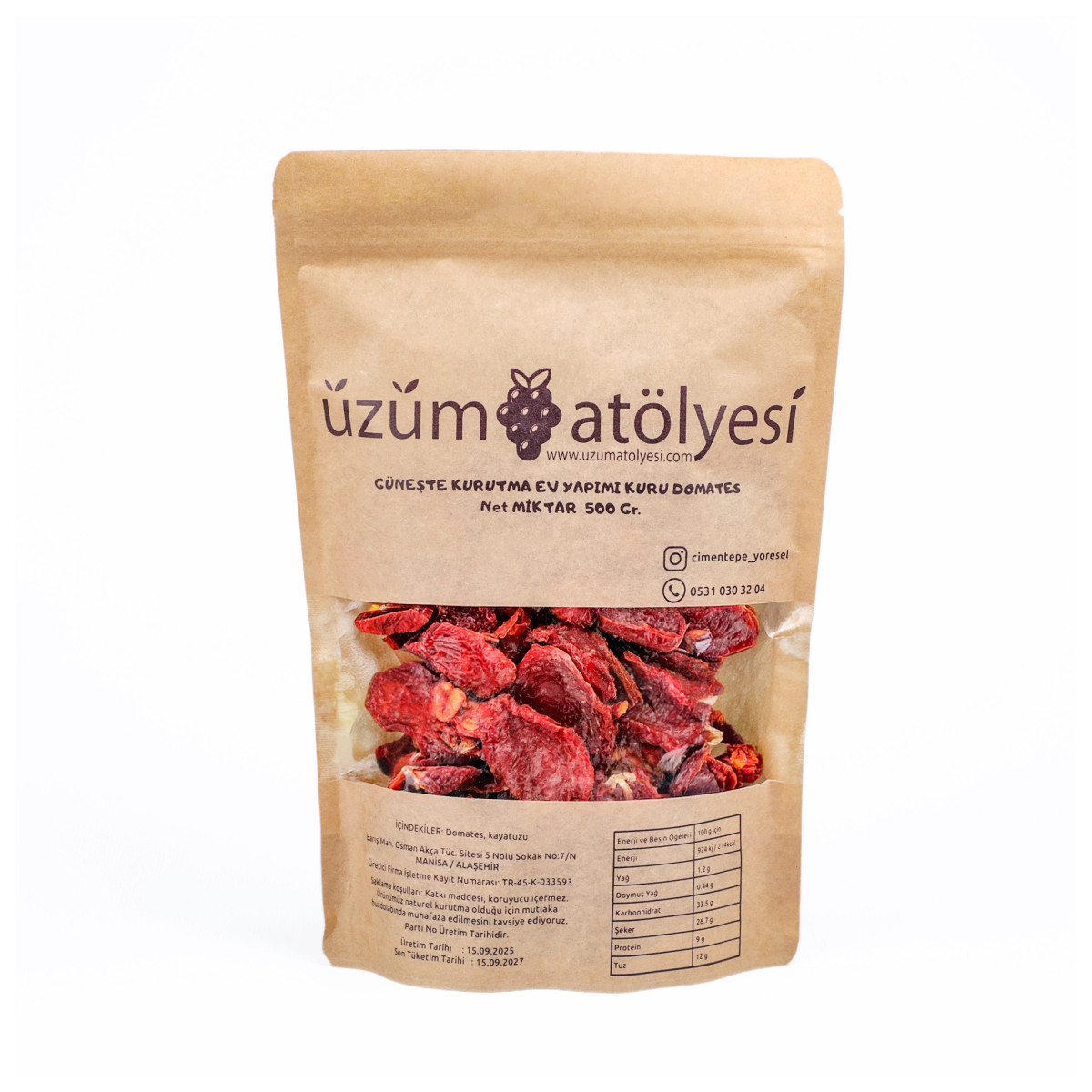 Üzüm Atölyesi’nin domates kurusu, katkı maddesi, renklendirici veya koruyucu içermez, tamamen doğal domateslerin kurutulmasına dayanır. Böylece satış sayfasında güvenilir, sade ve anlaşılır bir ürün açıklamasıyla sunulur.